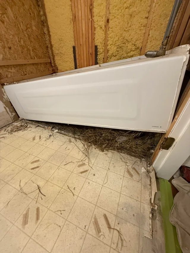 Figel said that here the birds entered by burrowing through the insulation in the ceiling of the garage, which is open-air and completely accessible to the birds. When Figel is done with renovations, he intends to fully seal off the inside of the new bathtub.